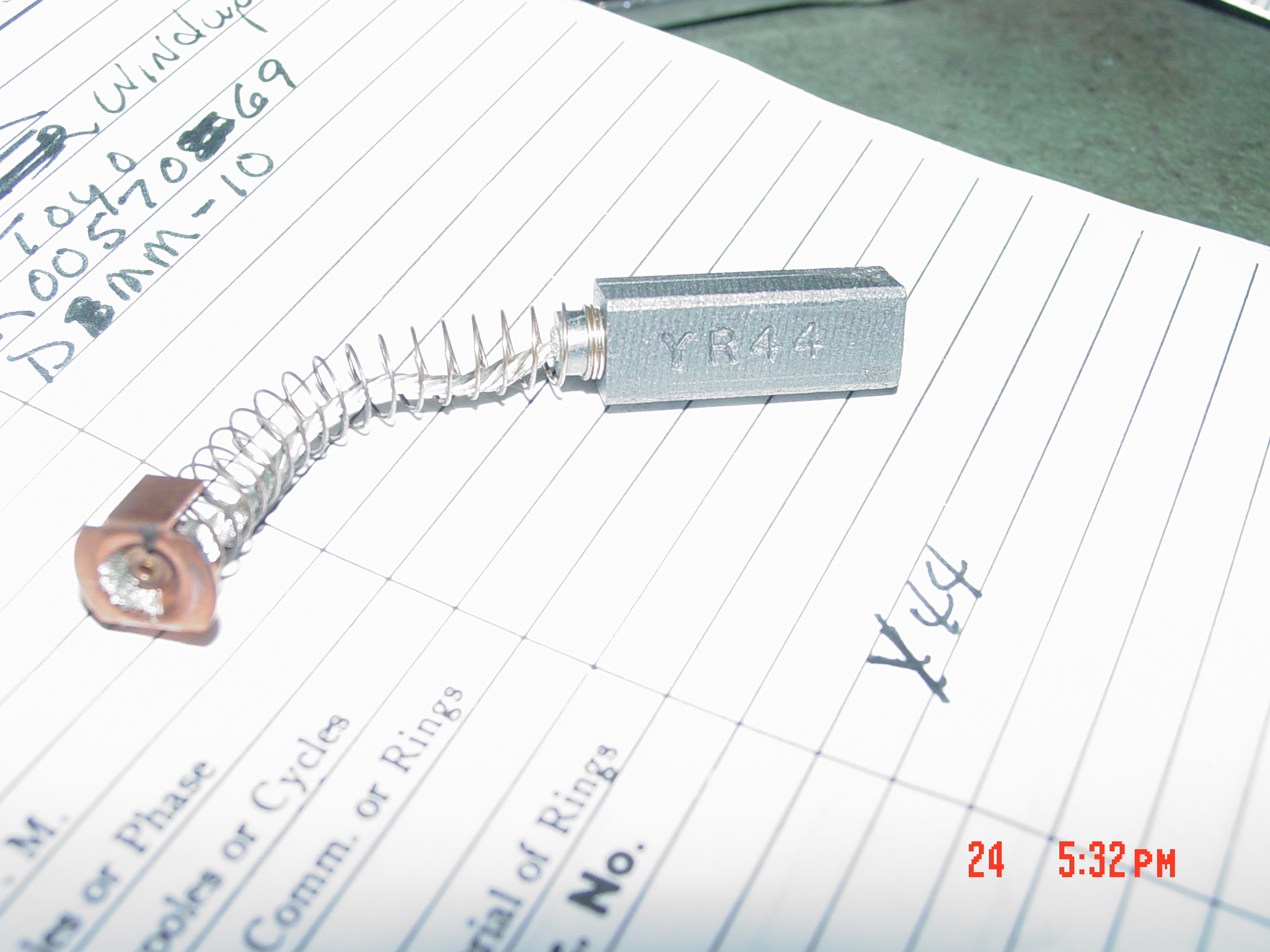 | APC #2 Wind up Guide | Toyo | K0057069 | .1KW | 24 | 6 | 1800 | Y44 / 30-233110034402 K254 | 2 | Part of brush | Hairline threading, grade change. Increase spring length, and open coils | DSC00029.JPG | |